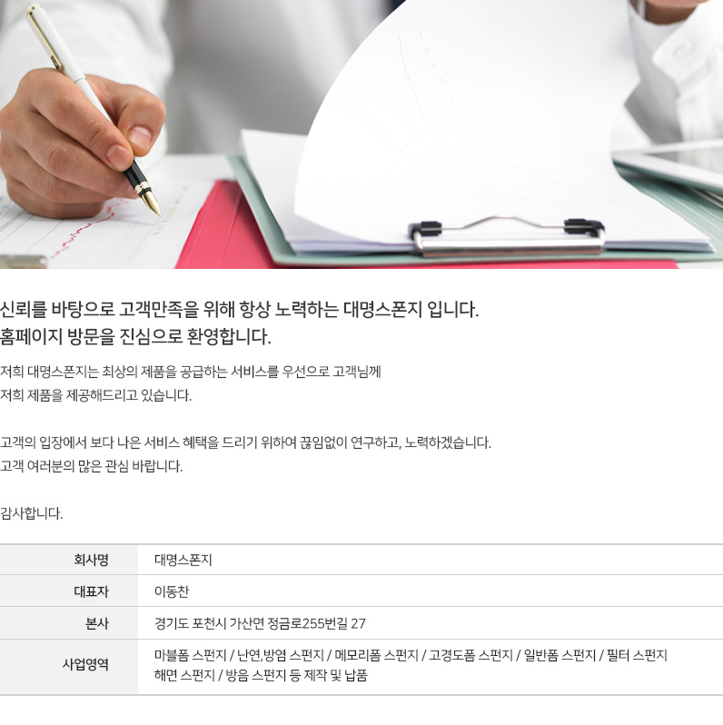상호 : 대명스폰지 ㅣ 본사 및 공장 : 경기 포천시 가산면 정금로255번길 27 (정교리 80-15) ㅣ 대표 : 이동찬 ㅣ 사업자등록번호 : 468-43-00066